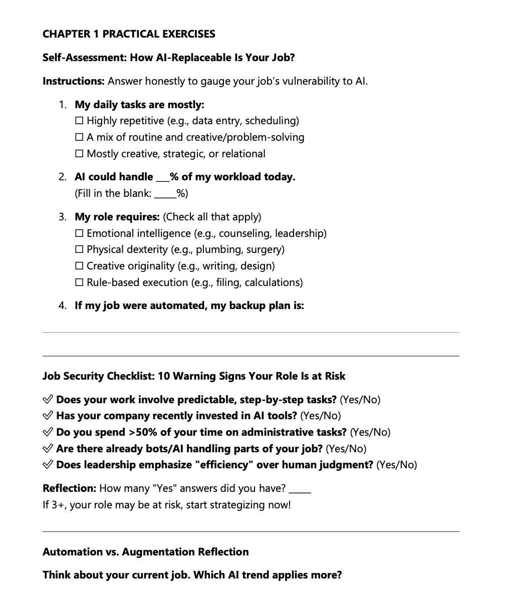 Packed with real-world case studies of people who’ve adapted and won, actionable checklists to help you protect your career immediately, interactive self-assessments to pinpoint your strengths and gaps, clear skill-building roadmaps showing exactly what to learn and how, and expert insights from leading economists, futurists, and industry insiders.